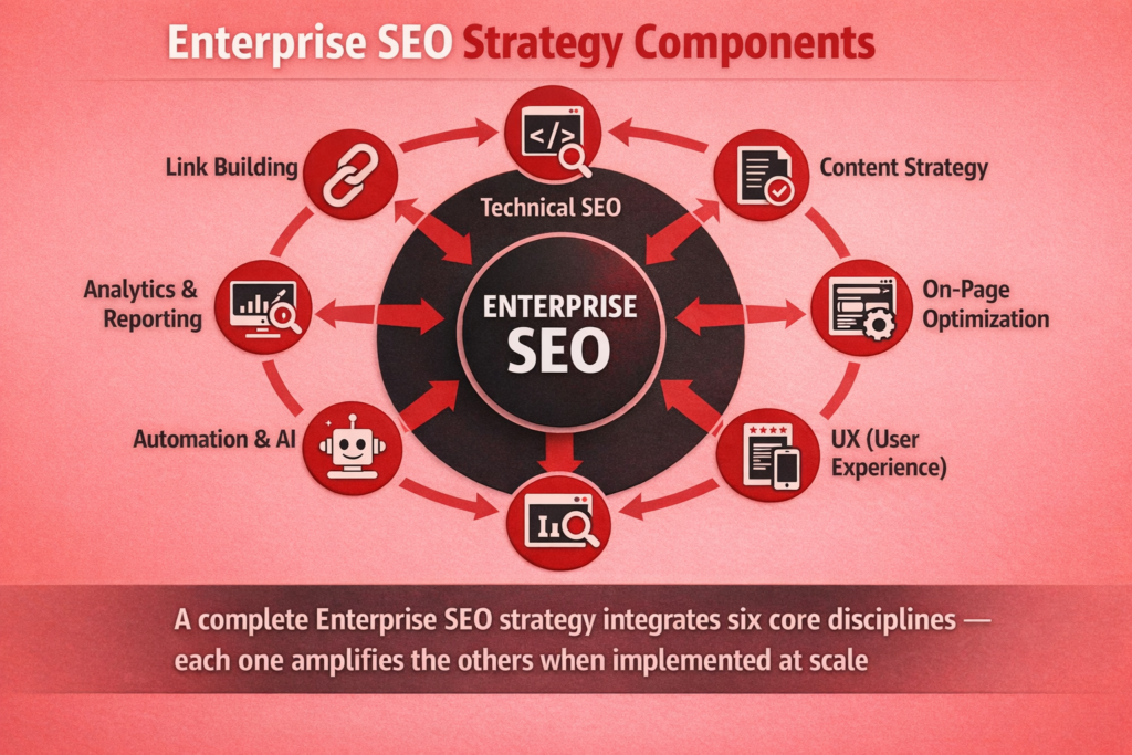 A winning Enterprise SEO strategy is not a single discipline. It is six interconnected disciplines that must operate in coordination. When one component underperforms, it actively limits every other component in the system. Here is what each one does and why it matters: